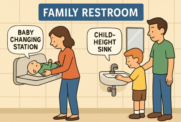 Clear, easily understood signage is a small design choice with a significant impact. Using large print, high-contrast colors, and universally recognized symbols makes locating facilities easier for young children, non-English speakers, and people with limited reading skills. For multilingual communities, multilingual signs make restrooms more accessible and approachable, ensuring that no family is left searching at a critical moment.